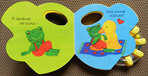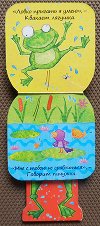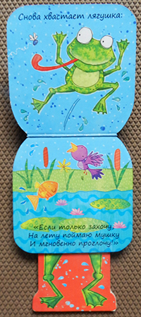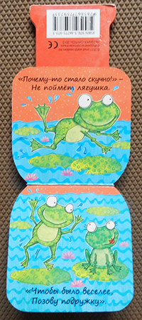 Картинки, в принципе, симпатичные, но довольно однообразные. Внутри простенькое стихотворение о том, что умеет делать лягушка: ловко прыгать, ловить и глотать мошек, а заканчивается мыслью, что если скучно, то надо позвать друга, будет веселее. В общем-то, большего от книжки-игрушки мне и не надо.
