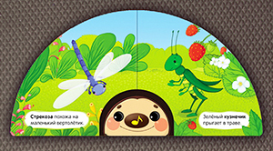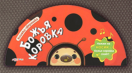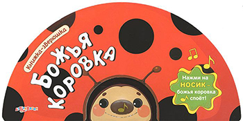 Забавная книжка с мордочкой божьей коровки, при нажатии на носик играет веселая песенка. У книги интересная конструкция, она листается с двух сторон, рассказывает о насекомых. Подача материала как раз для малышей: под изображением животного короткое предложение о нем, о какой-то узнаваемой черте или особенности.