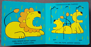 Конкретно эта книжка не самый хороший вариант. Слегка психоделические рисунки, про реалистичность изображения животных речь не идет, перенасыщенные "вырвиглазные" цвета. Слюнявить нельзя давать категорически, краска линяет, сомневаюсь, что она безвредная. Несмотря на то, что ребенок на книгу буквально "залипал", здесь эта книга только для примера, повторно я бы ее не купила. Сейчас я бы заказала такую книгу у какой-нибудь рукодельницы: качественную, красивую и безопасную.