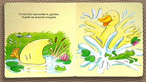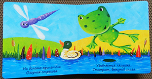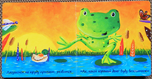 Как всегда в подобных книжках, стихотворение внутри простенькое, но в данном случае приятное. Оно о жизнерадостном лягушонке и о его друзьях - жителях пруда. Можно вместо этого стихотворения сочинить и рассказать ребенку свою историю о лягушонке, уж очень симпатичный это персонаж.