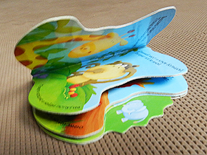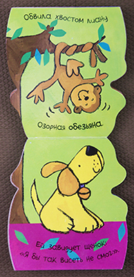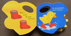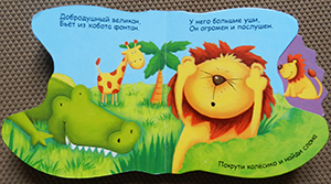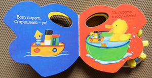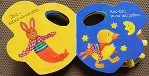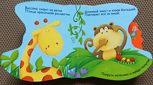 Книжка небольшого формата, картонные странички, но не очень-то плотные. Основная идея в том, что благодаря закругленной форме чуть приоткрытую книжку можно поставить на ровную поверхность и раскачивать из стороны в сторону по принципу неваляшки. Ну, не знаю, у нас она в качестве неваляшки не пошла: чтобы она не упала, раскачивать нужно довольно аккуратно, но ребенок так не умеет, сильно толкает.