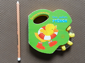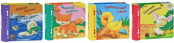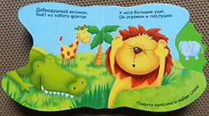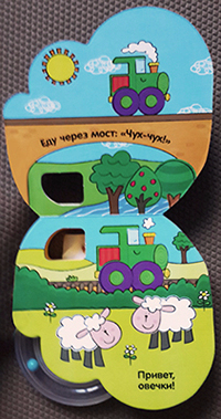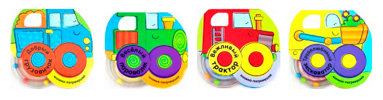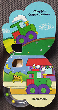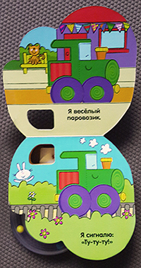 Почти то же самое, что в предыдущем пункте, только немного качественнее и чуть-чуть дешевле. А вот иллюстрации мне нравятся меньше, совсем уж примитивные. Ну и еще нет ободков для того, чтобы грызть. История не в стихотворной форме, но звукоподражания вроде "ту-ту" и "чух-чух" тоже присутствуют.