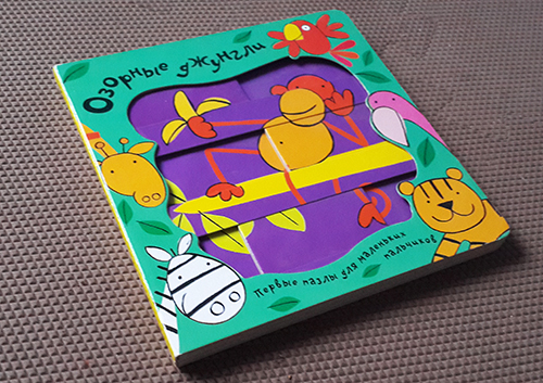 Сначала сын рисунок, естественно, не собирал, просто двигал туда-сюда детальки. И только после года и месяца я увидела не просто бездумное возюканье, а какую-то мысль в его действиях. Произошло это после того, как он двигал-двигал детальки, и вдруг они так удачно расположились, что ребенок неожиданно рассмотрел в рисунке что-то, осознал, что это объект, а не абстрактные линии. Я не хочу преувеличивать, конечно, ребенок не узнал в этом объекте обезьянку и не научился вдруг собирать пазл, но что-то у него там щелкнуло, он замер и поднял на меня радостные глаза, а потом ткнул пальцем и сказал свое любимое "Ыы!". Описываю его реакцию так подробно, потому что мне посчастливилось застать этот момент маленького триумфа ребенка, который сделал для себя неожиданное открытие. Когда видишь такое, испытываешь необыкновенные чувства! Больше, правда, у него так и не получилось собрать, но он старался. Книга лежала на полу, держать в руках и двигать малышу неудобно. Не знаю, какие аналогии он там для себя провел, но буквально через несколько попыток собрать обычный картонный пазл из двух частей, который я ему подсунула с книгой, он положил одну деталь на пол, а вторую уже пытался приладить к ней. Я связываю этот прогресс именно с книгой, хотя могу, конечно, ошибаться, это все может быть совпадением, а ребенок просто вдруг сам дошел до этого.