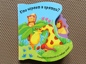 Книжка, в которой животные играют в прятки. Небольшого формата, странички из тонкого но качественного картона, в последнюю встроено колесико, которое нужно вращать и находить ответы на загадки. Сами загадки простые, в них описываются самые узнаваемые характеристики животных, ответы указаны прямо внизу каждой странички. Всего в книжке четыре загадки, а вот животных на колесике пять. Не очень понятно, является ли пятое животное, лев, ответом на вопрос на обложке - "Кто играет в прятки?", или находится там просто так. Вообще, иллюстрации довольно симпатичные, несмотря на нелюбимые мной глаза-точки, но вот логику их расположения на страницах я не поняла. Читала мнение, и я с ним согласна, что ребенок может из-за этого путаться при отгадывании загадок, но на практике пока это не проверила. Мой ребенок пока слишком мал для отгадывания загадок, я читаю ему их сразу с ответами, а он просто крутит колесико в свое удовольствие. Двигается оно свободно, без проблем. Надо сказать, у сына долго не получалось правильно прикладывать силу, чтобы крутить его, он просто тянул изо всех сил, очень злился, что оно не поддается, и выбрасывал книжку. Я много раз брала его ручку и помогала, пока он не научился. Зато какой радостью светилось его лицо, когда колесико поддалось)) Как мало надо для счастья!
