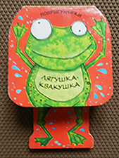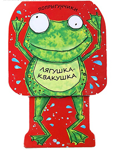 Книга небольшого формата, отлично подойдет для самых маленьких. Плотный качественный картон, среди страничек толстая сердцевина, в которой находится механизм для подпрыгивания: удерживая вертикально, нужно нажать на книгу, чтобы выступающий элемент, "ножка", зашел в корпус книжки, и отпустить - книжка подпрыгнет. Интересная задумка. И к ней хорошо подобраны персонажи, в серии кроме Лягушки есть Щенок, Зайка и Кошка.