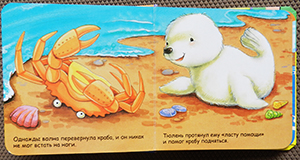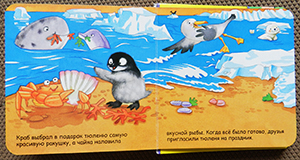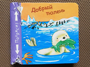Отличная книжечка! Качественный картон страничек, закругленные углы, неожиданно классный звук, который книга издает, если ее потрясти, имитирующий звуки тюленя (очень похоже, надо сказать) - все хорошо. Одно "но" - у книжки есть слабое место, и мне кажется, малыши-грызуны точно его найдут. Это место соединения корешка, в который и запрятана трубочка, издающая при тряске звуки, с плотным картоном остальной части обложки. Корешок сделан из очень тонкого картона, покрытого пленкой. В итоге сын разорвал его, достал трубку и наелся этой пленки.