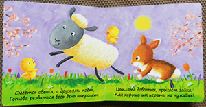 Как всегда у Мозаики-Синтез, книжка отличного качества, неубиваемая. Формат небольшой, малышу держать ее удобно, плотный картон, закругленные углы страничек. Как по мне, главная фишка книги - это тактильная вставка на обложке, мой ребенок может надолго "зависнуть" над ней, но и внутри книжечка очень приятная. Серия называется "Милашки-очаровашки" и не зря: иллюстрации действительно умилительные и добрые, цвета яркие и насыщенные, но не режут глаз. Слышала, некоторых напрягает цвет неба на иллюстрациях, но меня это как-то не смущает.