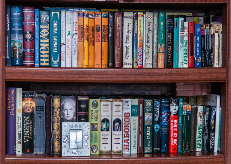 Вторая полка снизу справа - мои книги по фотографии, искусству, верстке и иже с ними. Чуть выше, мои художественные любимцы. Самая верхняя - общая полка худ. литературы. Слева сверху - полки мужа. Ну и у него еще есть лит. бардак на подоконнике, который я снимать не стала:) Раньше фанатично спускали с мужем последние деньги в книжных магазинах. Теперь те же деньги уходят на детские книги, а мы довольствуемся электронным форматом. В бумажном виде покупаем только специализированную литературу. На нвсех полках, кроме Левкиных, книги стоят в два ряда.