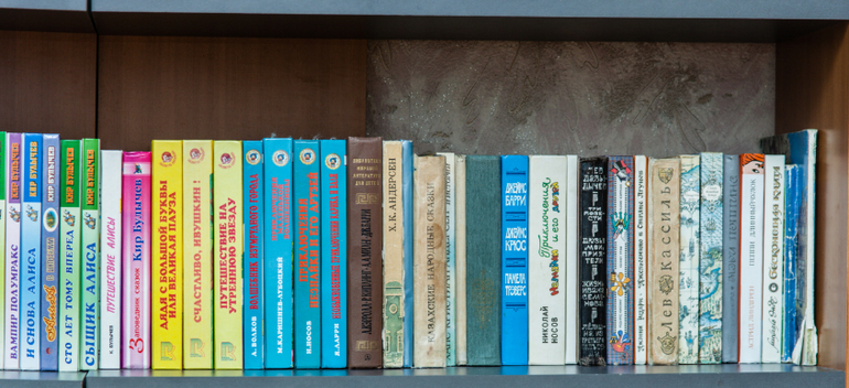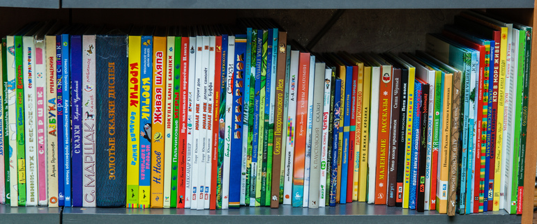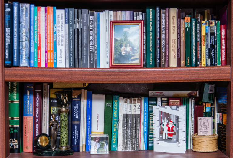 А вот и он. Нижние полки Левкины. Слева энциклопедии и слишком высокие книги. Справа тоненькие книги в коробках.