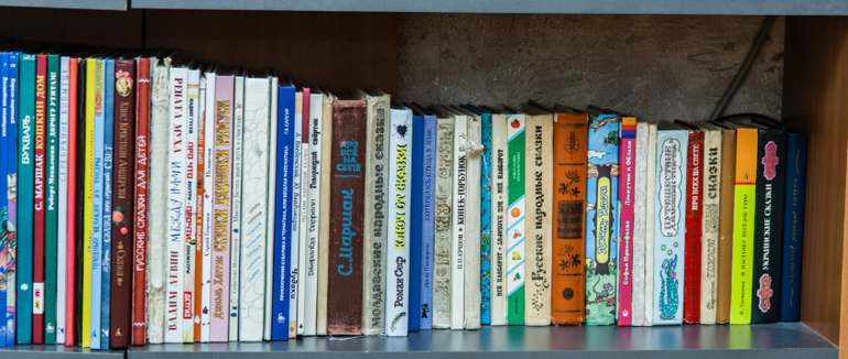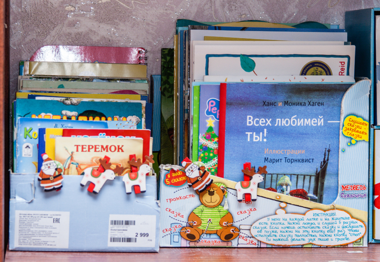 В маленькой коробочке книги на английском: картонные малого формата и "самиздат". Слева на полке стоят игровые и картонные книги.Справа - все остальное:)