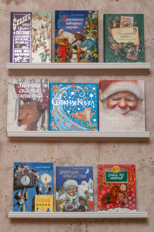 Слева недавно приобретенные икеевские полки с Новогодними книгами. Новогодние книги сразу после фотоссесии отправились в заслуженный отпуск до следующего декабря. Справа Левкин книжный стеллаж. Расстановка книг примерно такая: Нижние две полки от нуля до школы, следующие две - все, что старше, а самая верхняя - неформат + всякая познавательная литература (не по возрасту) + развивайки.