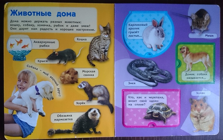 Когда покупала эту книгу то думала, что тут будут фотографии всех животных и рядышком их малыши, как на обложке. А книгу решили немного по-другому сделать: продолжили тему животных, а тему "мамы и малыши" поместили на разворот с открывающимися окошками, т.е. собственно кто кому малыш мы узнаем открывая окошки с вопросами.