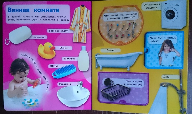 Детская комната, гостиная, кухня, ванная комната. По этой книжке мы очень легко изучили предметы быта.