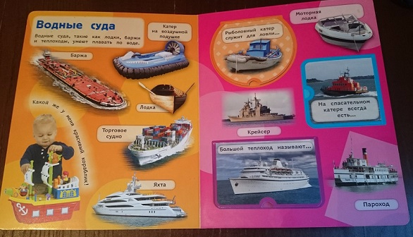Автомобили, поезда, воздушные суда, водные суда. Очень интересно, что и ребенок, который присутствует на каждом развороте, играет то с грузовиком, то с поездом и т.п., в зависимости от темы, которую мы видим на развороте