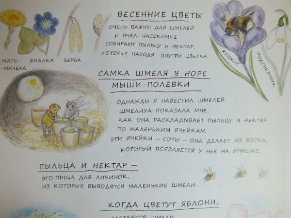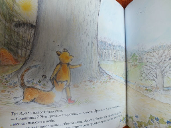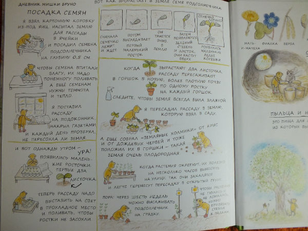 Но это все информация для мамы, ребенок не будет это слушать, так как нет истории, а история нам очень важна. Зато она есть дальше. Сюжет прост: мишка Бруно со своей собачкой делают разные важные весенние дела - от весенней уборки до посадки семян. Сыну очень понравилась книга.