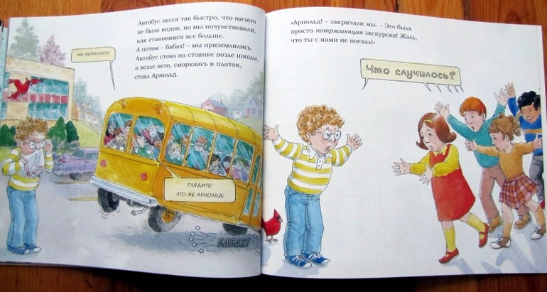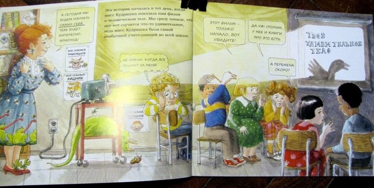 Книга-комикс с весьма занятным сюжетом. Мисс Кудряшка, самая необычная учительница в школе, решила показать детям фильм о человеческом теле. А на следующий день - провести эксперимент на самих себе. Ребята отправились в необычный музей на выставку, чтобы узнать, как человеческое тело извлекает энергию из съедаемой пищи. Но до музея не доехали. После перекуса они сели в автобус, чтобы ехать дальше, и… И попали внутрь человеческого организма. Организм принаделжал их однокласснику Арнольду, который за поеданием чипсов забыл про необходимость сесть в автобус. Ребята попали внутрь Арнольда.