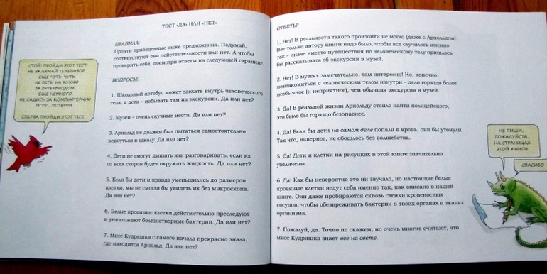 В конце книги есть вопросы и ответы для проверки своих знаний после прочтения. Может ли быть правдой то, что произошло с ребятами? Смогли бы они разговаривать, если бы на самом деле попали внутрь человеческого тела? Уничтожаются ли болезнетворные бактерии при помощи белых кровяных клеток? Вопросов семь, и на каждый дан правильный ответ для самопроверки.