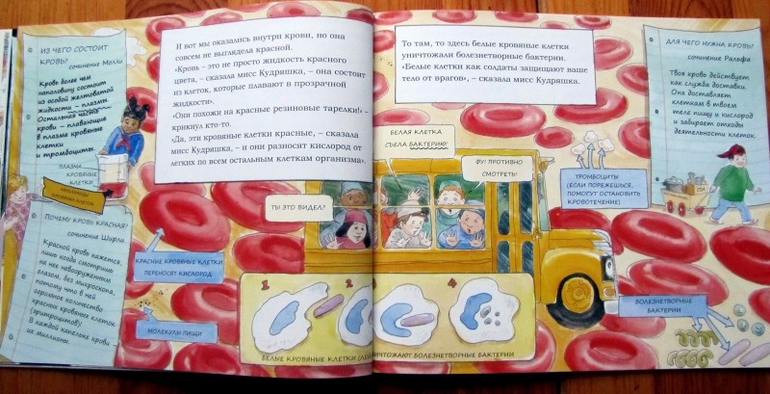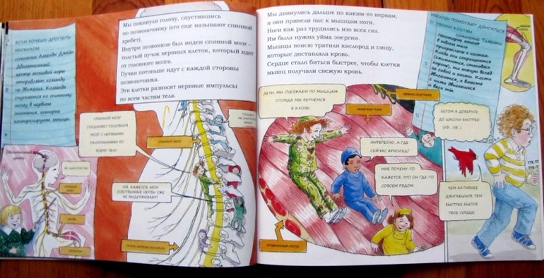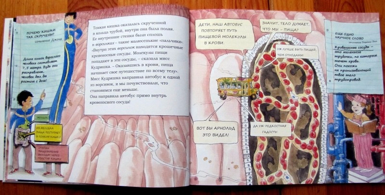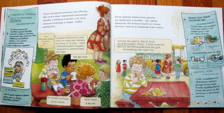 Оригинальная энциклопедия-комикс, подробно рассказывающая о том, что происходит внутри нашего тела. Научно-популярный язык разбавлен детскими высказываниями, мультяшные картинки не вызывают никакого отвращения, а сама книга отлично подойдет для семилеток. Которым рано изучать анатомию во всех ее проявлениях, но знать, что происходит с пищей, которую только-только съели, уже интересно.