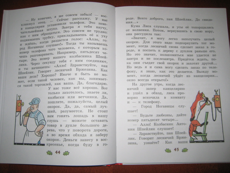 "Было похоже, что кума опять что-то задумала. И правда, придя домой, она взяла карандаш, подаренный ей еще Руженкой, расправила бумагу, в которую был завернут окорок, и что-то на этой бумаге написала. Потом она стрелой помчалась к дереву у поворота дороги. Оглядевшись, лиса осторожно опустила записку в дупло, а потом расположилась как можно удобнее в кустарнике, что растет на пригорке справа от дороги. Безмятежно подремывая в своем укрытии, она стала поджидать лесничего и колбасника. И они явились за добычей ровно в полдень...