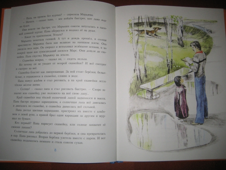 Для меня ключевые слова: "С папой". Это самый главный человек в жизни Марьяши. Человек необыкновенный, художник, способный, например, из простой деревяшки сделать чудесную куклу-царевну, у которой взаправду месяц под косой блестит... Который может поведать о путешествии в Синие края не обычными словами, а быстрыми рисунками-набросками... В конце концов, это человек, ради которого ты, маленькая и беззащитная, пойдешь ночью по улицам спящего города в аптеку со страшными оранжевыми глазами за лекарством... Книга о том, что в жизни есть самое главное. А главное - это семья, главное - это любовь :)