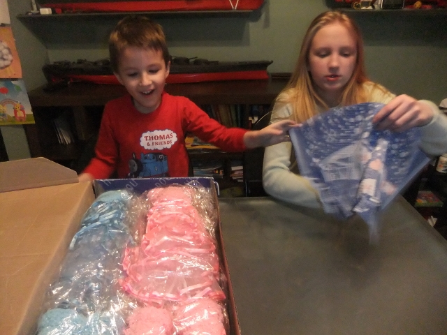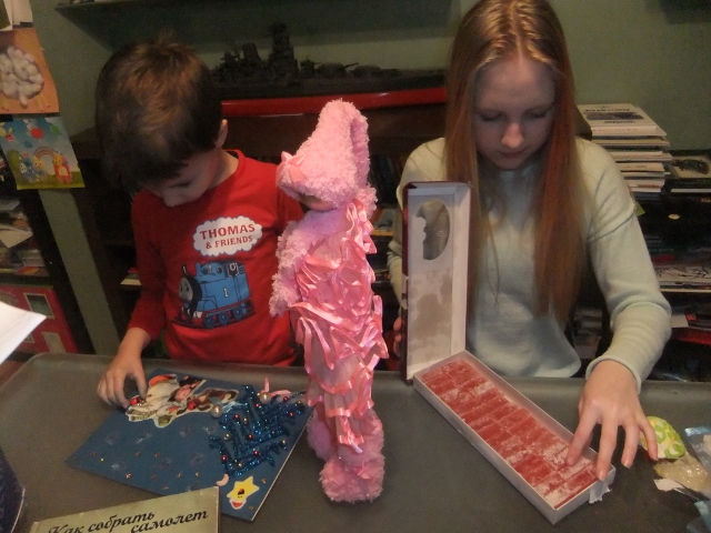 И как только ребёнок вернулся из путешествия, я тут же усадила всех открывать подарки (нет бы - покормить-помыть-спать уложить, ага)