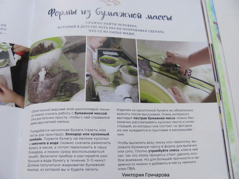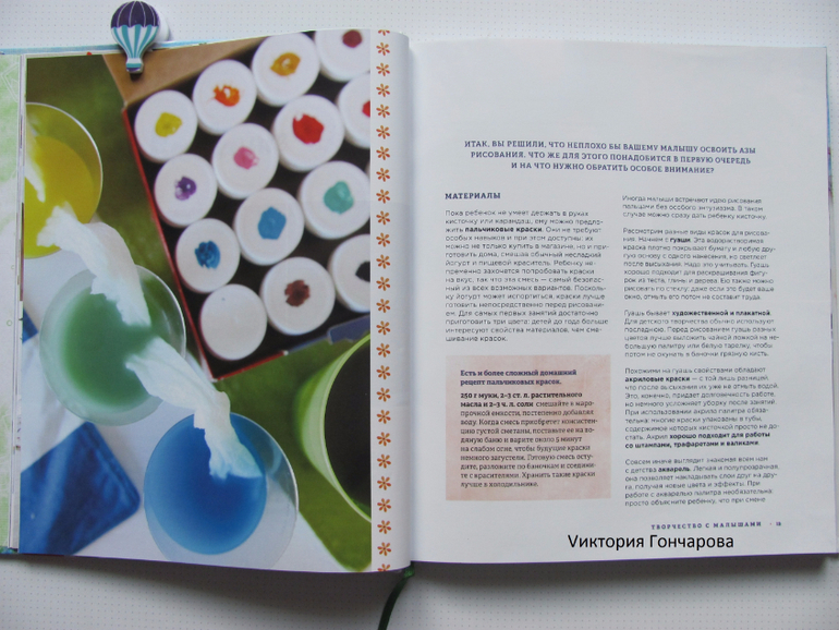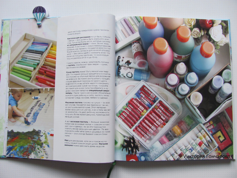 Перед каждым разделом есть информация основных материалах. Например перед разделом Рисование, рассказывается обо всех видах красок, как выбрать кисть, бумагу и пастель, таблица смешивания цветов. Даже есть рецепт домашних пальчиковых красок.
