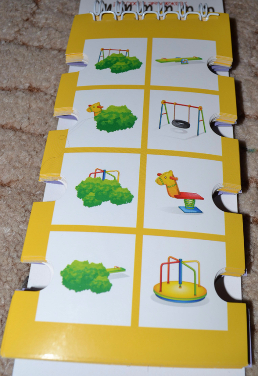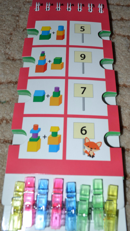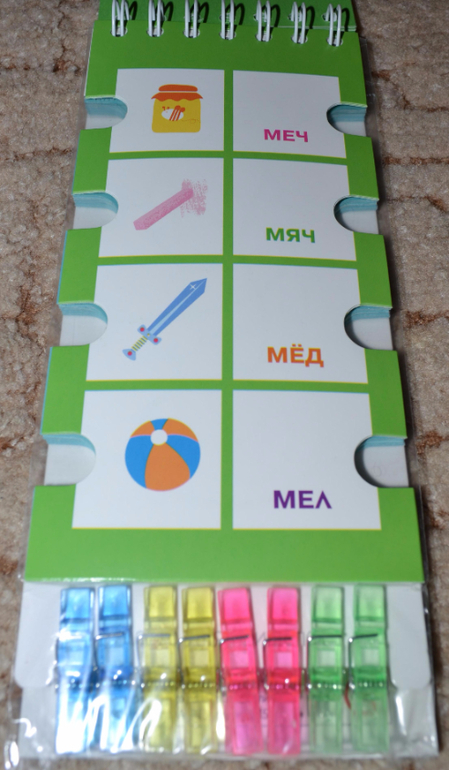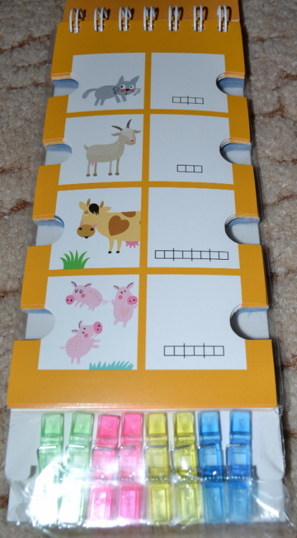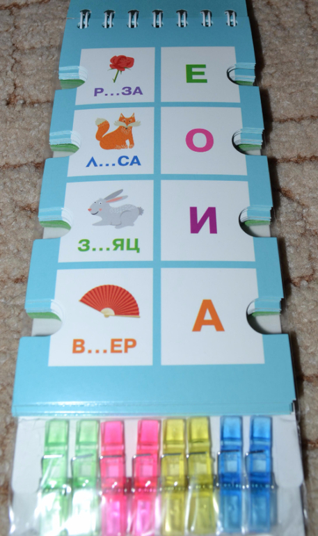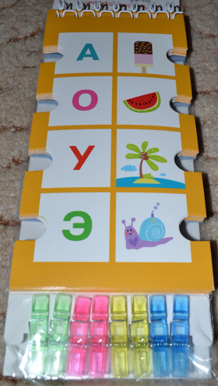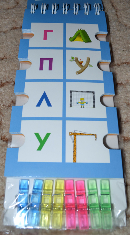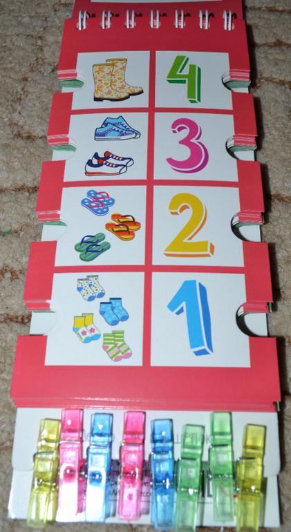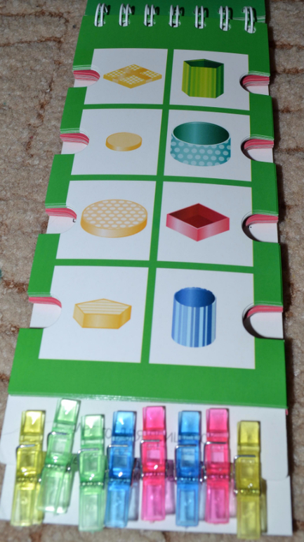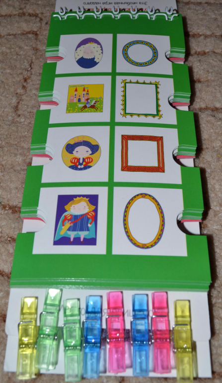 По поводу прищепок хочу Вам подсказать. У нас продается похожая серия развивающих книжечек. Она тоже с такими же высечками, но вместо прищепок к книге прицеплен длинный шнурок, и его надо на эти высечки наматывать