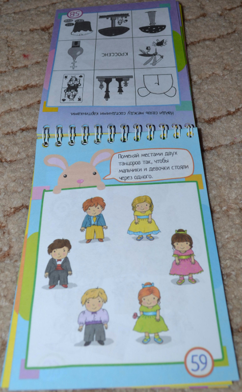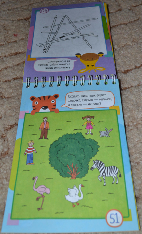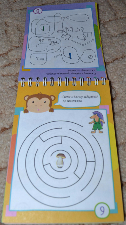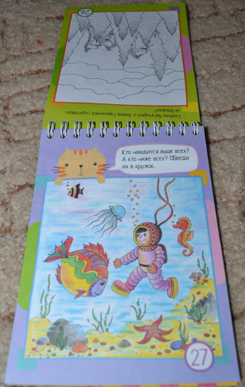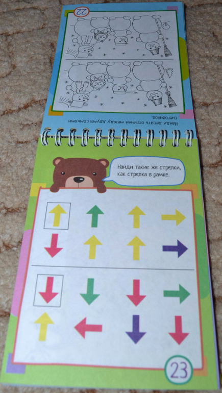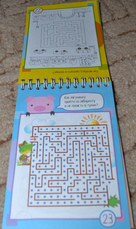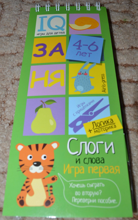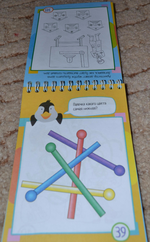 Блокноты без прищепок, которые предполагают использование карандашей в процессе занятий, показались мне чуть менее (только чуть-чуть) интересными, и картинки там показались простоватыми. Причём на разворот одна страничка цветная, вторая нецветная. Конечно, нецветные задания чуть менее интересны ребёнку. Эти блокноты мы уже не "щёлкаем" за один присест, сына хватает только на несколько разворотов.Некоторые задания простоваты, обыденные, но попадаются и очень любопытные))) В любом случае рекомендую присмотреться. Покажу поближе.