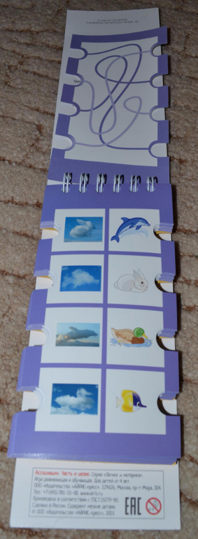 Сначала в нашем доме появился блокнот с прищепками "Ассоциации" . Купили мы его в подарок, однако когда Дима увидел, просто потребовал заказать ему такой же)) Когда я поняла, что это не стандартные развивашки, а что-то новое, действительно направленное на развитие интеллекта, а не просто мышления, я решила пополнить коллекцию. Моего непоседу сейчас тяжеловато уговорить посидеть позаниматься, однако эти пособия с прищепками настолько интересны и разнообразны, что даже он не может оторваться, пока не сделает все задания. Справедливости ради замечу, что прищепки в комплекте никуда не годятся, но это не беда, их можно заменить любыми другими прищепками (у нас, например, целая коробка прищепок из фикс-прайса). Хотя мы мало занимаемся с прищепками, т. к. это долго и надоедает. Сына больше интересуют сами задания, нежели прищепки. Блокноты двусторонние, как бы из двух частей. Никаких заданий, только картинки и твой интеллект))) То есть сначала ты должен сообразить, что требуется по заданию, а потом выполнить и само задание. Но по сути везде в этих блокнотах нужно найти пары по каким-то признакам. А вот уже по каким признакам, ты должен догадаться. Проверить себя можно с помощью лабиринтов на обратной стороне каждого задания. Задания идут по мере усложнения. Покажу поближе.