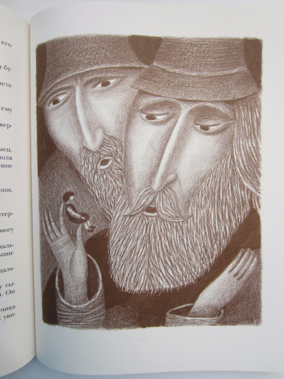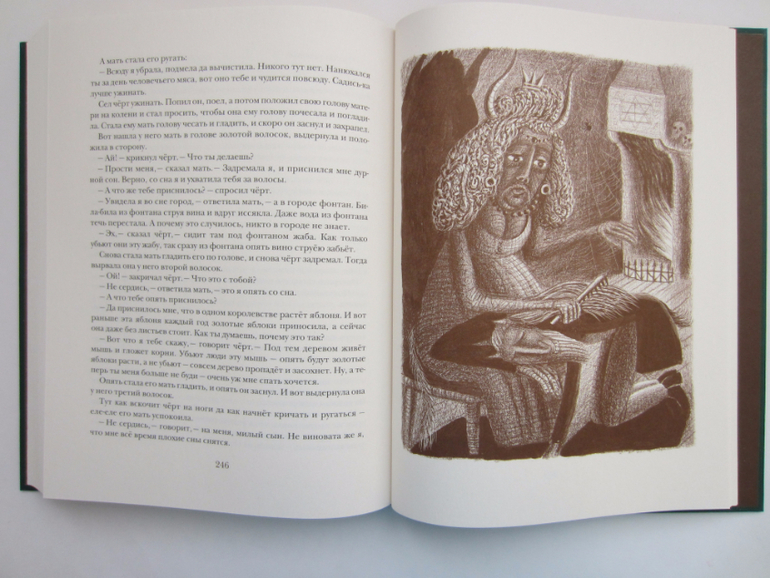 Иллюстратор сборника - Борис Забирохин. Прочувствовать его особый сказочный мир мне помогли уже иллюстрации к "Белой лебёдушке". Это не мир, полный красок, оттенков и полутонов, это другой мир. Он какой-то древний, мифологический, погружающий нас в особое состояние. Эти иллюстрации не для малышей. Сказкам братьев Гримм его образы чаще всего подходят, они не шаблонные и очень необычные. Особенно к страшным.