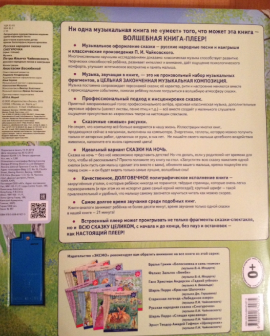отзывыВ садике на НГ утреннике нам подарили отличную книгу-плеер БЕМБИ. Мы от нее были в восторге. Переплет толстый, страницы очень толстые, фоном является классическая музыка и сверху наложен профессиональный голос рассказчика. Ребенок сможет самостоятельно нажимать на кнопочки и можно не бояться, что он повредит страницы. Т.к. они сделаны из очень плотного картона. Иллюстрации очень красочные и приятные для глаза. Под КАТом много фото: