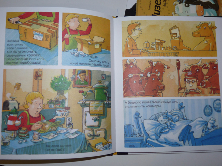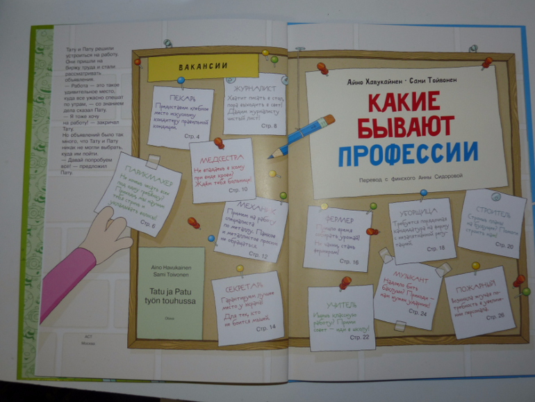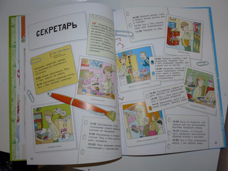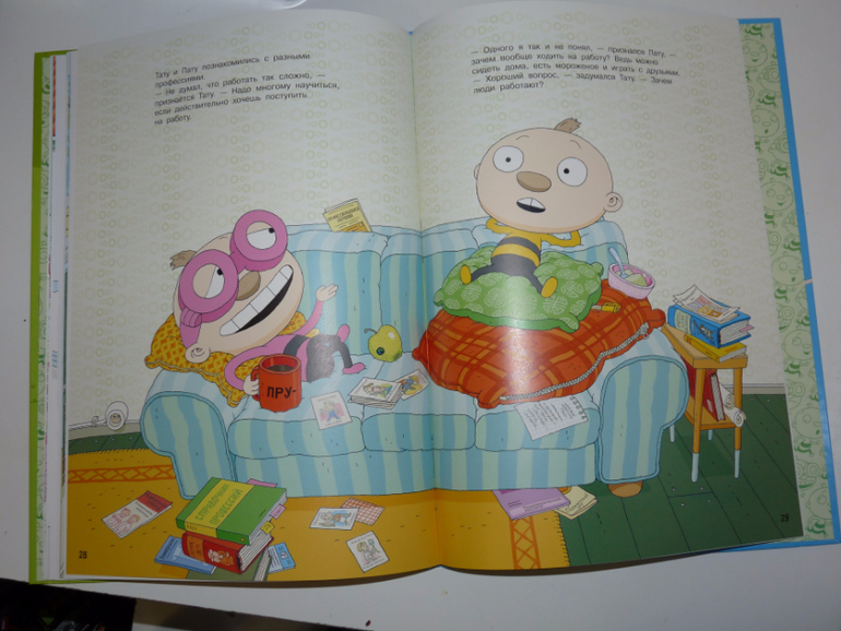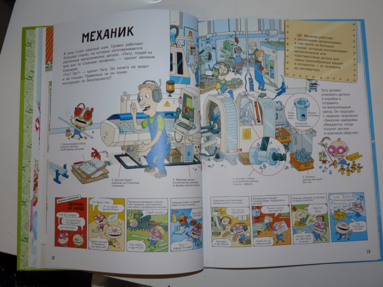 Это точно наш вариант, Артём уснул с ней в обнимку. Очень жаль, что другие книги не найти. Удивил формат книги, она огромная, на полку не вместилась. Текста достаточно, познавательная, иллюстрации смешные, много карикатур, есть где посмеяться. Описывается 12 профессий, Артёму больше всего понравился разворот про пожарных. Много деталей, рассматривать можно очень долго. Книга замечательная.