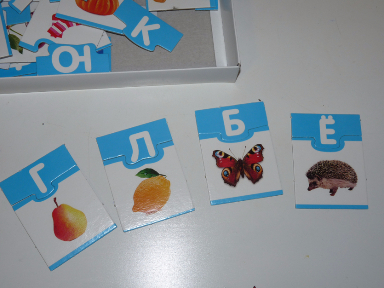Для изучения букв и слогов есть ещё две игры. Азбука. Знакомимся с буквами, определяем первый звук в слове, 33 буквы, 63 карточки для детей 4-7 лет. Есть правила для родителей и описаны 5 игр.
