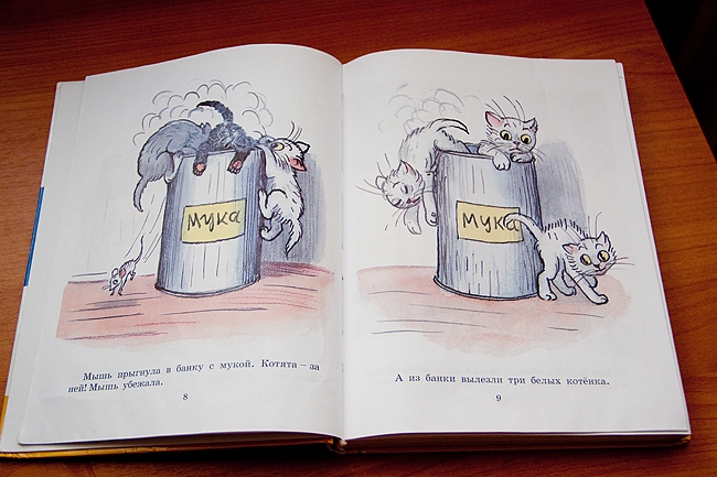 Наши любимые истории "Под грибом" и "Три котенка". Носим книгу по квартире и периодически "пристаем" к брату с просьбой почитать :).