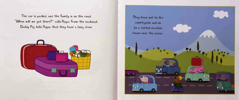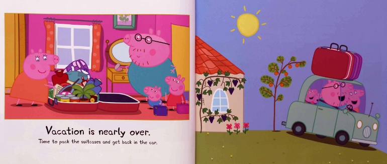 Еще в поездку я вооружилась книгой Peppa Pig and the great vacation. Учитывая популярность этого мультика у Вани, решила, что книга послужит палочкой-выручалочкой в кризисных ситуациях. Итог - безусловно вызвала большой восторг вначале, читали по несколько раз подряд первые дни, а потом у Вани совершенно пропал к ней интерес. С моей стороны могу сказать, что там неплохая тематическая лексика и яркие, знакомые картинки. Но истории как таковой нет, а поэтому мне было скучновато. Думаю в дальнейшем мы ограничимся просмотром мультика.