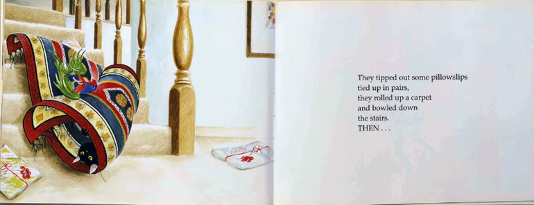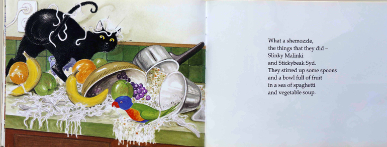 Следующие книжки, я думаю, к нам немного опоздали. Мы прочитали их в 2,7 и они были для Вани уже слишком простыми. Думаю, что в два года или даже пораньше они пользовались бы большим успехом. Так, например, книга про шкодного кота Slinky Malinky, Open the door автора Линли Додд - хорошие стихи и простая, понятная даже маленьким, но такая шкодная история. Ваня в этой книге больше всего впечатлился непонятным и забавным словом shemozzel.