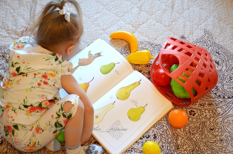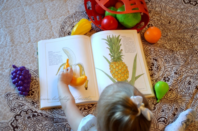Я очень люблю книги, которые после нескольких совместных прочтений способны увлечь ребёнка к самостоятельному изучению. Книги с элементом недосказанности, но уже запустившие процесс огромного любопытства. Арише очень нравится искать на страницах фрукты и сравнивать картинки с игрушечными плодами, задаваться множеством вопросов, и увлеченно перелистывать страницы снова и снова.