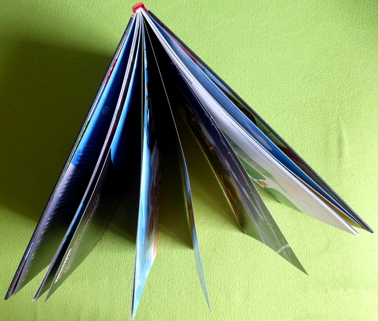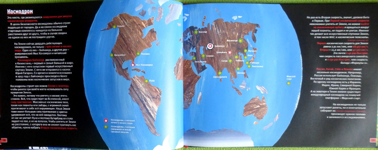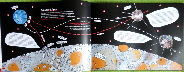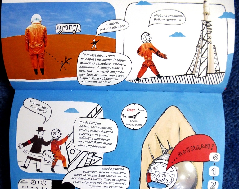 В книге чередуются вертикальные и горизонтальные развороты. Это даёт больше свободы, позволяет лучше передать динамику старта или показать строение ракеты. Благодаря такому расположению рисунков можно рассмотреть материал в мельчайших подробностях, например, скафандр, а взлет ракеты смотрится более зрелищно и действительно впечатляет.