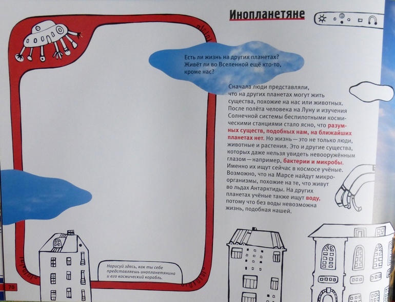 Разворот про инопланетян, где ребенку предлагается нарисовать инопланетянина, как он его себе представляет
