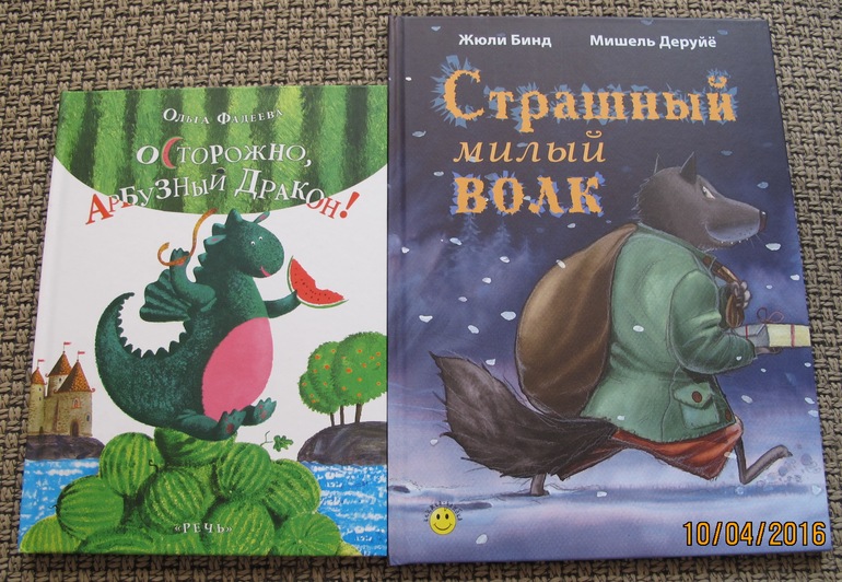 Две книжки - очень понравились моим девчонкам. Арбузный дракон милый, очень понравился младшей, но вот запах у него!!! Самая "ароматная" книга из всей стопочки, за месяц не выветрился... А так он нам очень понравился! Страшный милый волк тоже, он душка.)))