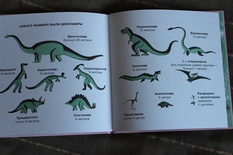 Тем, кто давно и всерьез увлекается братьями нашими вымершими, она не подойдет. Здесь дана скупая информация по нескольким самым любопытным видам динозавров. Есть страничка с их размерами (информация поразила даже папу) и сравнительными иллюстрациями.