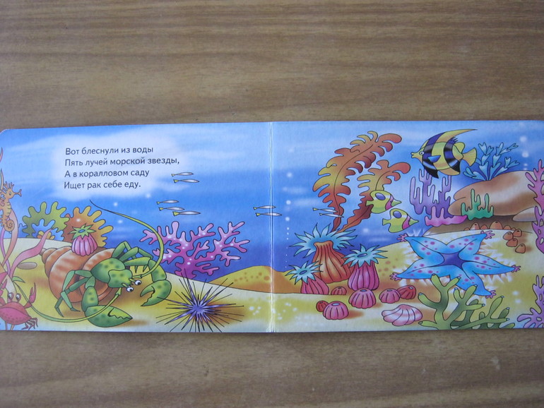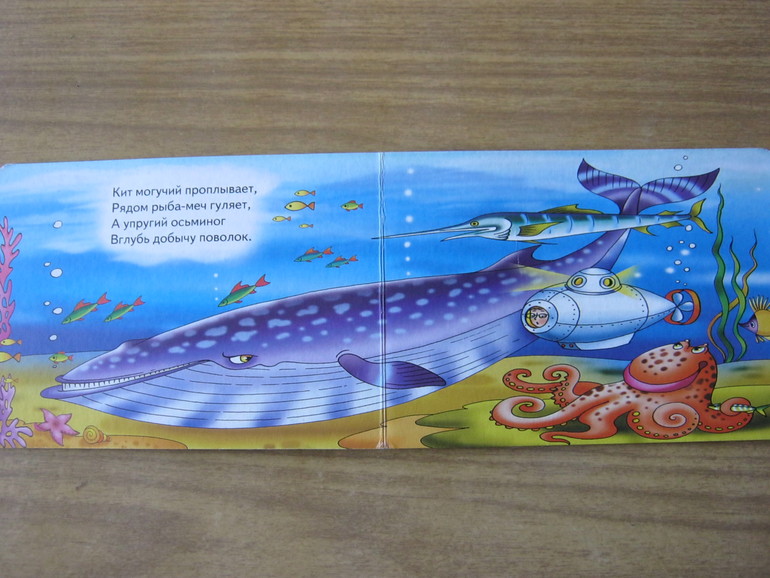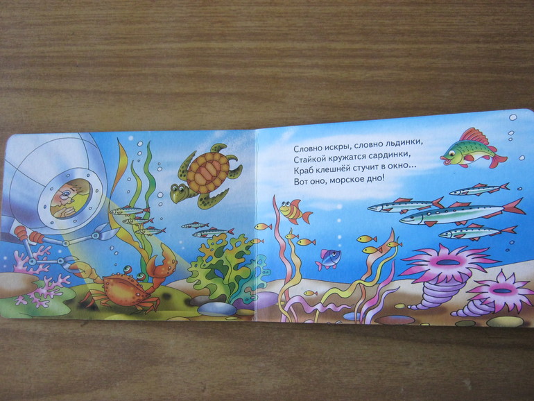 для самых маленькихЯ хочу показать маленькую книжечку-картонку Подводное путешествие, которую не раз упоминала в своих обзорах, потому что, несмотря на немудрящее содержание и простенькие компьютерные картинки, картонка нежно любима детьми всех возрастов и подарила нам много радостных минут.