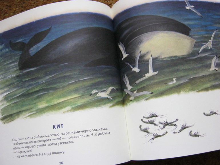 Всегда удивляюсь тому, как дети слушают книгу Кто в море живет - ведь вроде бы и читать особенно нечего- несколько строчек на странице, и иллюстрации темные, надо было их на меловке печатать, они были бы изумительными. Дети же слушают как роман про графа Монте-Кристо.