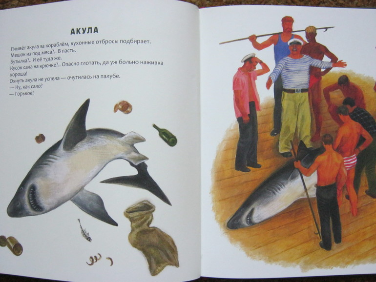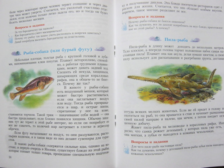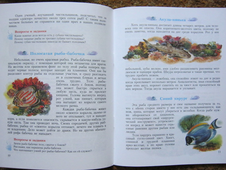 В тонкой книжечке столько полезной информации! Главки есть небольшие - на полстраницы, есть и побольше - на страницу-полторы. Иллюстрации мелковаты, но вполне конкретны, для знакомства, а уж тем более, узнавания, вполне достаточны. Мне нравятся названия глав - Синий хирург, Акула-нянька, Гладкая свистулька, Четырехрогий кузовок.