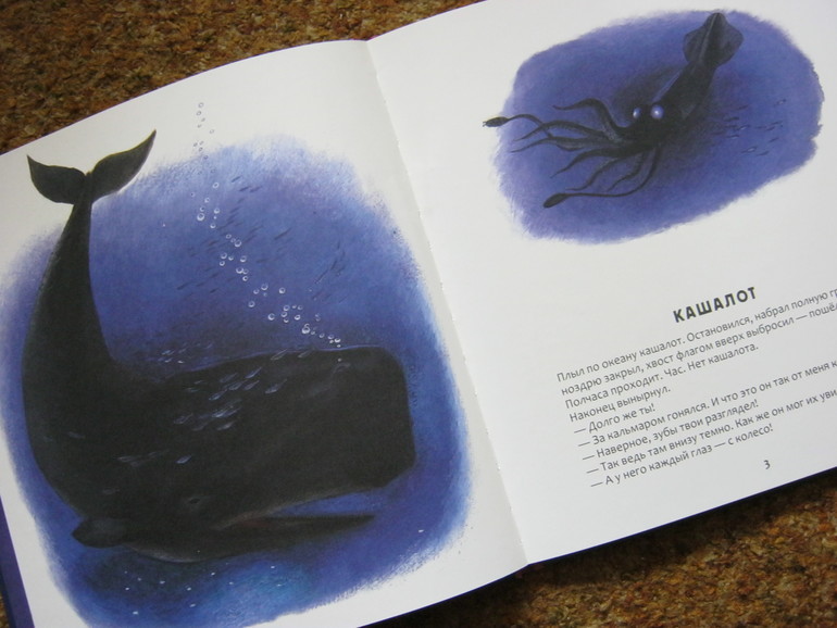 Вроде бы и ни о чем. А все же мы узнаем что кашалот может целый час пробыть под водой, прежде чем всплывет до нового вздоха, что нырять он может на такую глубину, где мало что и разглядишь, что на этой глубине обитает кальмар, у которого каждый глаз величиной с колесо. Просто и образно, что детям и нужно.