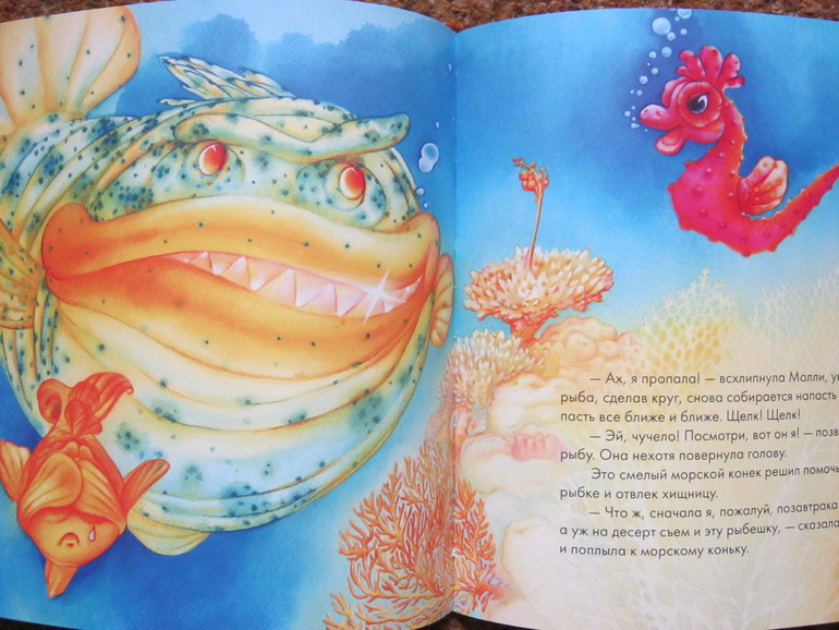 пришел ей на выручку смелый морской конек - отвлек он рыбу, увел ее от Молли и юркнул в расщелину, в которой рыбина застряла.