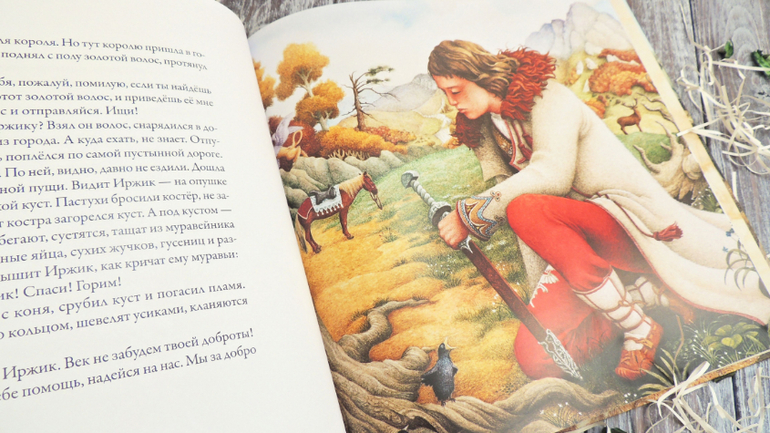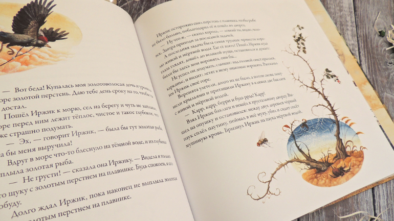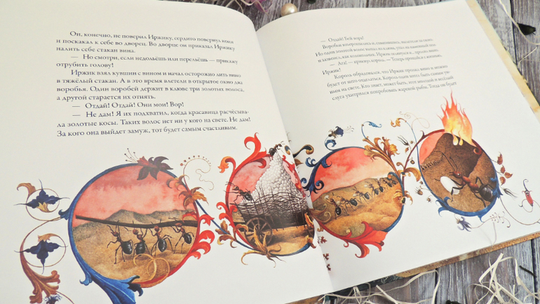 Есть в книге иллюстрации на два разворота, есть текст без полностраничных иллюстраций, но все равно очень красиво украшен.
