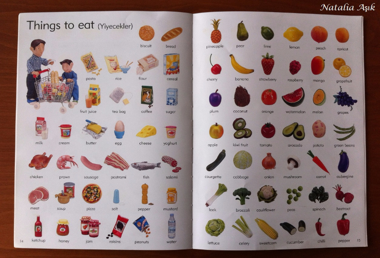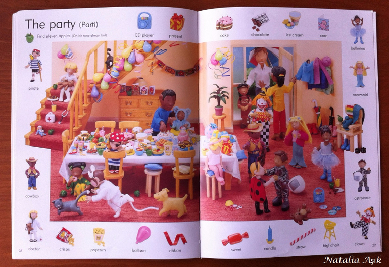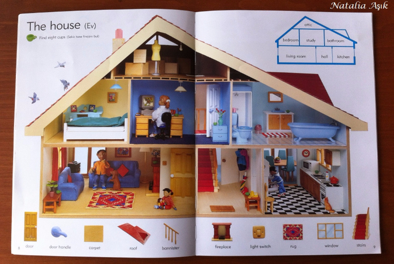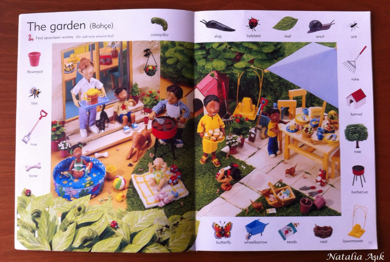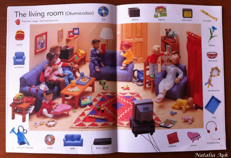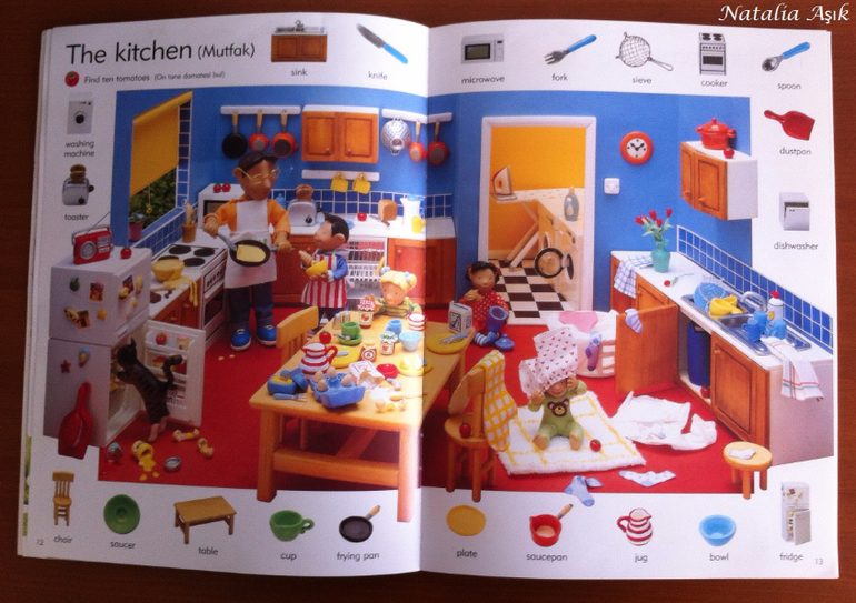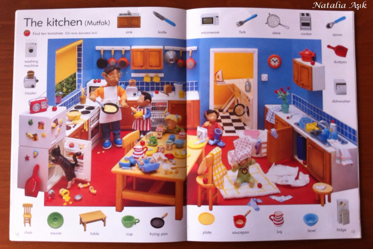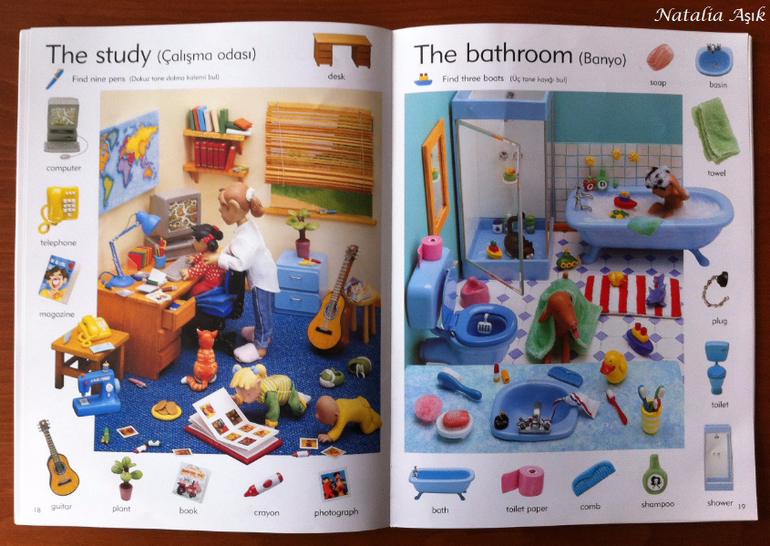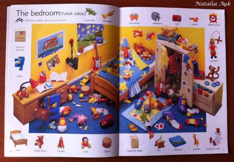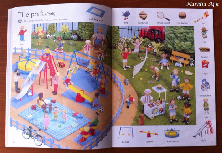 Книгу я покупала "в запас", т.к. изучение английского в наших планах еще не скоро - нам бы сначала разобраться с турецким и русским. Обычно я стараюсь не покупать книги впрок, хранить особо негде, но иногда вижу такие интересные издания, что просто невозможно пройти мимо. И да, иллюстрации в словаре меня зацепили, я просто не смогла не купить :) Дома я убрала книгу на дальнюю полку, собираясь забыть о ней на годик-другой. Но дочь незаметно подросла и однажды дотянулась-таки до этой заветной полки, И провела ревизию купленных запасливой мамой книг. :) В квартире неожиданно наступило затишье. Со смутными догадками я кинулась искать источник этой тишины, а мамы активных деток знают, ребенок затихает, когда он что-то нашел и начинает исследовать и творить :) или вытворять :) В детской я обнаружила дочь среди разбросанных книг, увлеченно листающую этот словарь. Она даже не заметила, как я вошла, как собрала книги, как ушла на цыпочках :) С тех пор это словарь "переехал" на нижнюю полку, где живут дочкины книги, которые она может брать и листать сама. И не важно, что эта книга на сайте издательства маркирована 6+, ее смело можно начинать "читать" и в два, и даже раньше. Для нас книга оказалась многофункциональной, это не просто словарь с английской лексикой, это еще и поисковая книга, на каждой странице помимо основных предметов, вынесенных на поля, предлагается найти еще что-то, например, 10 футбольных мячиков в парке, или 5 кружек в гостинной. Можно играть, можно рассматривать, можно рассказывать по картинкам, можно придумывать свои истории, можно просить показать различные предметы, можно считать, искать предметы разных цветов, формы, да в общем много чего можно придумать, чем не отличное пособие для развития речи?
