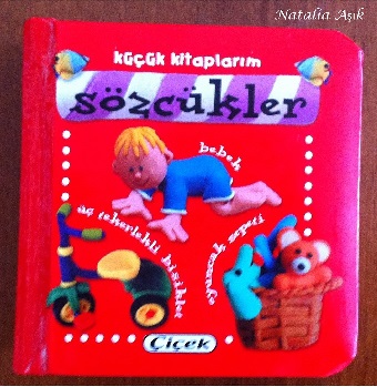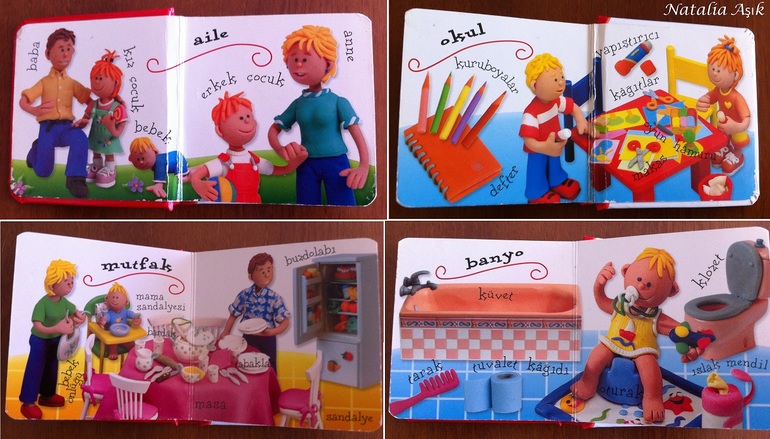 И еще, про пластилиновые иллюстрации.. Припоминаю, был у нас маленький словарик на картоне, буквально наладонник, самая первая книжка-картонка, так вот там тоже были иллюстрации в подобном стиле, и это был хит у ребенка с момента появления книги у нас дома. Он ездил с нами в гости, в магазины, в поездки, в парк, его таскали по всем комнатам, но он неплохо сохранился, и до сих пор дочка иногда его листает :) Вот он, наш старенький герой :)