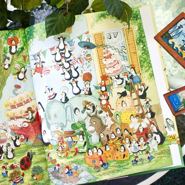 Иллюстрации этой книги полны деталей, мелочей и подробностей. Каждый разворот посвящен отдельной комнате в пингвиньем доме: холл, кухня, гостиная, веранда, чердак, библиотека, ванная комната, подвал, детская и двор. И в каждой комнате находится огромное количество пингвинов, которые занимаются разными делами, каждый своим. И вот нашему другу Пампушку, среди всего этого балагана, нужно найти бабушкин наряд: полосатое платье, зеленые чулки, ожерелье из розового жемчуга, шаль, шляпка с павлининым пером, красные перчатки, желтую сумочку, сиреневые сапожки и оранжевое пальто. А поможет ему в этом его верный друг крокодильчик Огуречик и, конечно же, читатели )))